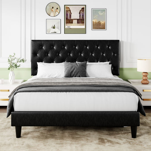 Sifurni Faux Leather Upholstered Platform Bed Frame with Adjustable Diamond-Tufted Headboard